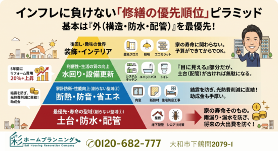 放送内でお話しした、「リフォーム高騰時代に、いかに無駄な出費を抑えて家を守るか」。